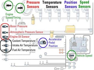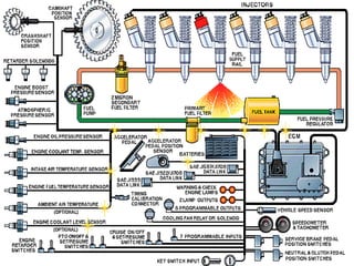 El documento proporciona información sobre los sistemas de inyección diesel EUI. Describe los cinco componentes principales del sistema: inyectores, bomba, ECM, sensores y actuadores. Explica cómo los sensores monitorean el motor y envían datos al ECM, el cual controla los actuadores como los inyectores para regular el funcionamiento del motor.