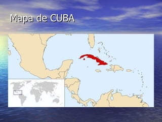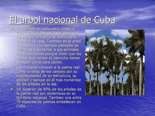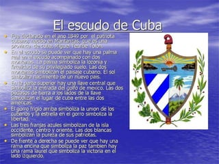 Este documento presenta información sobre la bandera, el pájaro nacional y la flor nacional de Cuba. La bandera de Cuba fue diseñada por Narciso López y sus colores representan la sangre derramada en la guerra y los ideales de pureza. El pájaro nacional es el Tocororo, conocido por sus vivos colores y su resistencia a la cautividad. La flor nacional es la Mariposa, asociada con la belleza y gracia de la mujer cubana.