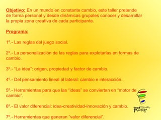 Este taller de dos días busca desarrollar la creatividad de los participantes a través de dinámicas grupales y personales para que puedan generar ideas e innovación que impulsen el cambio social. El programa incluye sesiones sobre las reglas sociales, el pensamiento lateral, herramientas para convertir las ideas en motor de cambio, y técnicas para expandir la creatividad de una manera divertida y práctica. La evaluación se basa en "píldoras teóricas" y tareas creativas con el objetivo de lograr un av