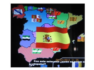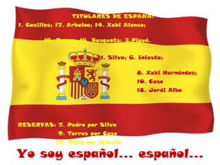 El documento presenta el once inicial y los suplentes de la selección de España para la final de la Eurocopa 2012 contra Italia. Relata los goles marcados por Silva, Jordi Alba, Torres y Mata que le dieron la victoria 4-0 a España. También destaca las actuaciones de Casillas, Xabi Hernández, Iniesta y Torres durante el partido y celebra la tercera gran competición internacional ganada por España en los últimos 6 años.