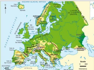 Europa está situada en el hemisferio norte, en una de las zonas templadas de la Tierra. Tiene una costa recortada con varios accidentes costeros como cabos, islas, penínsulas, golfos, rías y fiordos. El relieve de Europa incluye llanuras y sistemas montañosos como los Alpes y el Cáucaso, con el Monte Elbrus y el Mont Blanc como los picos más altos. Europa tiene varios tipos de clima como el mediterráneo, oceánico, continental y polar, y la vegetación varía desde