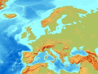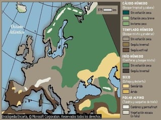 Este documento proporciona información sobre la geografía física y humana de Europa. Describe la localización y límites del continente, su relieve diverso formado por placas tectónicas, su clima templado influenciado por los océanos, sus principales ríos y lagos, y la flora y fauna original que ha sido afectada por la actividad humana. También resume la distribución de la población, incluida su densidad y migraciones, así como la diversidad étnica del continente.