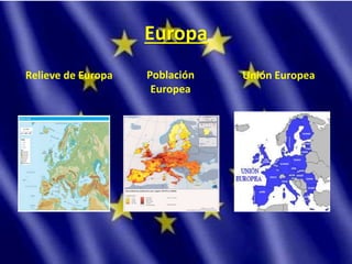 El documento describe la geografía y población de Europa. En cuanto al relieve, destaca las montañas como los Alpes y Pirineos, así como las llanuras de Europa Central y Oriental. La población europea se concentra en las costas occidentales y el sector terciario emplea a dos tercios de los europeos. La Unión Europea surgió en 1957 con seis países fundadores y ahora cuenta con 27, gobernada por el Parlamento, Consejo y Comisión.