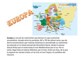 Europa es uno de los continentes situados entre los paralelos 36o y 70o de latitud norte, que limita por el oeste con el océano Atlántico, por el este con Asia a través de los montes Urales, el mar Caspio y el Cáucaso, y por el sur con el mar Mediterráneo. Noruega ha reconocido a la población Sami como una etnia indígena de acuerdo a las resoluciones de la ONU, y los pueblos Nenets y Komi, que viven cerca de los Urales