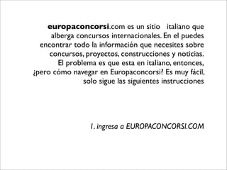 El documento describe europaconcorsi.com, un sitio italiano que alberga información sobre concursos internacionales de proyectos, construcciones y noticias. Explica cómo navegar fácilmente por el sitio en italiano siguiendo 8 pasos sencillos como hacer clic en imágenes de proyectos para ver más detalles, ampliar imágenes, acceder a más proyectos recientes o conocer los resultados y detalles de concursos específicos.