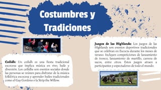 Este documento describe algunas costumbres y tradiciones culturales de Escocia. Detalla los juegos de las Highlands, eventos deportivos tradicionales que se celebran en verano, y los ceilidhs, fiestas donde la gente baila y disfruta de música folklórica. También explica que la vestimenta tradicional escocesa incluye el kilt y el tartán para los hombres, y faldas y vestidos de tartán para las mujeres. Finalmente, menciona platos típicos de la cocina escocesa como el haggis y el