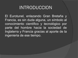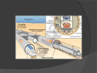 El Eurotúnel es un túnel de 50.5 km de longitud que conecta Francia e Inglaterra bajo el Canal de la Mancha. Se inició su construcción en 1987 y se completó en 1993, convirtiéndose en una importante infraestructura de transporte internacional que permite el cruce en solo 35 minutos. Está formado por tres galerías conectadas cada 375 metros, incluyendo dos túneles ferroviarios y uno de servicio.