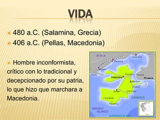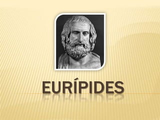 Eurípides, nacido en 480 a.C. en Salamina y fallecido en 406 a.C. en Macedonia, fue un dramaturgo griego inconformista que escribió 92 tragedias, de las cuales se conservan 18. Destacó por su realismo en los personajes y su capacidad para renovar la tragedia griega, siendo considerado un crítico de su tiempo. Aunque su obra fue incomprendida en su época, Bertrand subrayó su enfoque en retratar la humanidad tal como es, en contraste con sus contemporáneos.