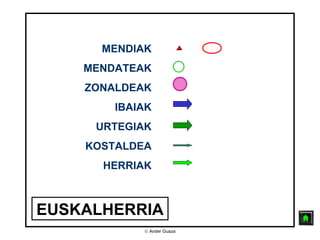 Este documento presenta una lista de montañas, cordilleras, zonas, ríos, lagos y pueblos del País Vasco. Enumera numerosas montañas como Kolitza, Ganekogorta, Oiz y Gorbea, así como cordilleras como Orduna, Urbasa y Aralar. También menciona zonas como Enkarterri, la zona minera y Busturia, y ríos como el Bidasoa, Deba, Artibai y Nervión. Entre los lagos se encuentran Villareal y Yesa. Finalmente, lista varias local