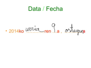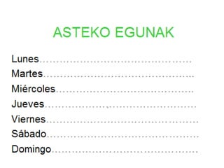 Este documento contiene normas y vocabulario sobre el idioma vasco. Incluye reglas sobre puntualidad, materiales escolares, respetar turnos de palabra y hacer tareas. También presenta vocabulario sobre días de la semana, meses, preguntas, profesiones y verbos como ser y estar.