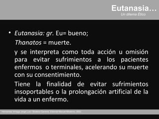 El documento discute la eutanasia como un dilema ético. Define la eutanasia como la acción u omisión para evitar el sufrimiento de un paciente terminal acelerando su muerte con consentimiento. Explica que existe un debate ético sobre si evita el sufrimiento o si nadie puede decidir cuándo termina la vida de otro. También clasifica la eutanasia en directa e indirecta y discute conceptos como el suicidio asistido y la distanasia.