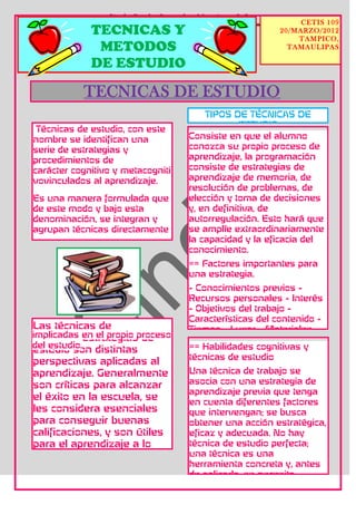 Este documento describe diferentes técnicas y métodos de estudio. Explica que las técnicas de estudio son estrategias y procedimientos cognitivos y metacognitivos relacionados con el aprendizaje. También describe factores importantes para una estrategia de estudio efectiva como conocimientos previos, interés, objetivos, y planificación. Finalmente, discute métodos de estudio basados en la memorización como el ensayo y aprendizaje mecánico, así como métodos de sumarización.