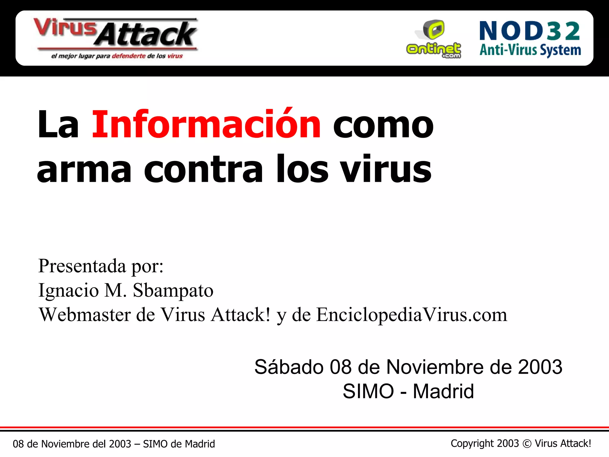 Este documento resume una conferencia sobre cómo la información puede usarse como arma contra los virus informáticos. Explica que los principales virus hoy en día son los gusanos de internet y los troyanos, los cuales se propagan a través del correo electrónico y aprovechando vulnerabilidades de seguridad. También destaca la importancia de sitios de noticias antivirus, compañías antivirus y boletines de seguridad para mantenerse informado sobre nuevas amenazas. Finalmente, enfatiza que la educación de usuarios y administradores a