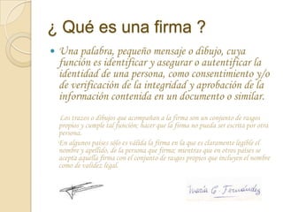 La grafología analiza la escritura para identificar rasgos de la personalidad. Examina la firma para verificar la identidad de una persona en documentos legales. Se pueden aprender las características de una firma como la igualdad, legibilidad, dirección, velocidad y forma para identificarla. Otros rasgos como dibujos también pueden analizarse grafológicamente.