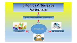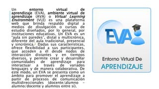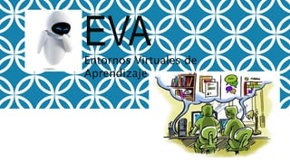 El documento describe los entornos virtuales de aprendizaje (EVA), definidos como plataformas web que brindan apoyo digital a cursos diseñados por instituciones educativas. Los EVA ofrecen flexibilidad a los participantes y permiten el aprendizaje colaborativo a distancia. El documento luego discute las características, elementos, sujetos y beneficios de los EVA, así como desafíos comunes como la capacitación docente y problemas técnicos. Finalmente, analiza sistemas EVA disponibles y consideraciones sobre la evaluación en este
