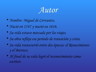 Este documento resume la vida y obra de Miguel de Cervantes, con un enfoque en su novela más famosa, El Quijote. Explica que Cervantes vivió entre el Renacimiento y el Barroco y que su obra más importante fue El Quijote, publicada en dos partes en 1605 y 1615. Resume la estructura y personajes clave de la novela, incluyendo las aventuras de Don Quijote y Sancho Panza, y explica que la intención de Cervantes era parodiar los libros de caballerías populares de la época.