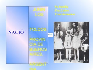 María Eva Duarte de Perón nació en 1919 en Los Toldos, Argentina. Trabajó como actriz en Buenos Aires antes de conocer a Juan Perón en 1944, con quien se casó en 1945. Eva participó activamente en la campaña electoral de 1946 y fue fundamental en la creación de la Fundación Eva Perón, que brindaba ayuda social. Desarrolló una carrera política pero enfermó de cáncer en 1950, falleciendo el 26 de julio de 1952 a los 33 años. Es recordada como una figura que cambió la historia de Argentina al defender los derech