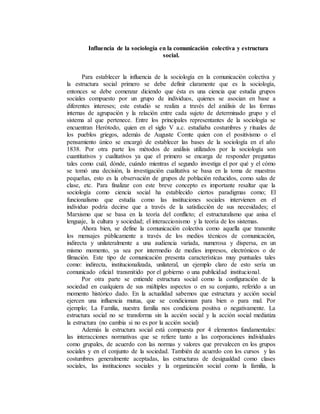Este documento discute la influencia de la sociología en la comunicación colectiva y la estructura social. Explica que la sociología estudia los grupos sociales y las relaciones entre individuos y sistemas. Luego define la comunicación colectiva como aquella transmitida públicamente a través de medios de comunicación masiva e indirecta, y la estructura social como la configuración de una sociedad en un momento histórico. Finalmente concluye que la sociología influye en ambas al estudiar cómo los mensajes son recibidos en los diferentes niveles y clases