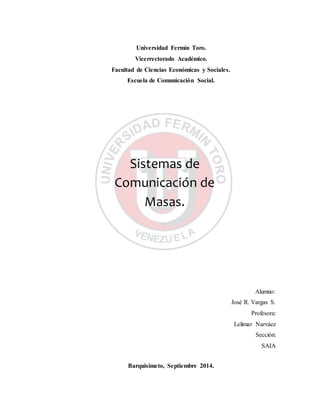 Este documento discute los sistemas de comunicación de masas y su rol en la sociedad. Explica que estos sistemas constan de tres componentes: transmisor, canal de transmisión y receptor. También analiza las funciones económicas, políticas y socioculturales de los medios de comunicación masiva y cómo estas han evolucionado con las nuevas tecnologías. Finalmente, discute la relación recíproca entre la tecnología y la sociedad y cómo los avances tecnológicos han beneficiado a los medios de comunicación masiva.