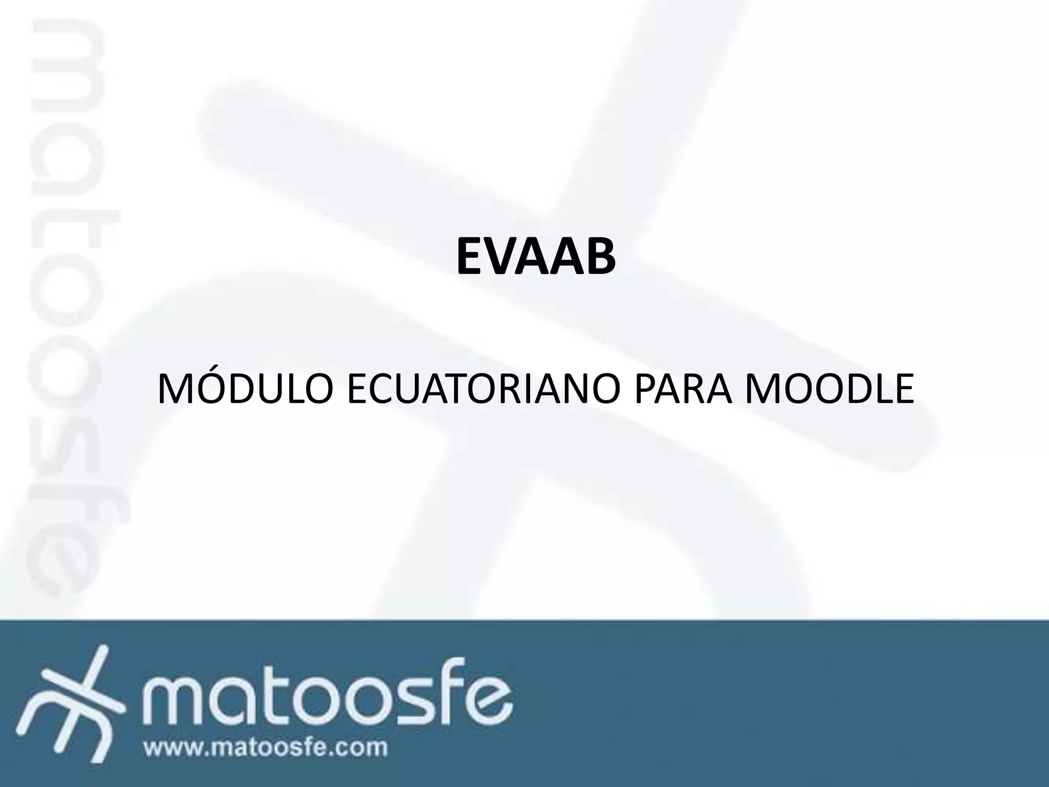 Este documento presenta EVAAB, un módulo ecuatoriano desarrollado para Moodle que permite realizar evaluaciones con elementos de apoyo como pistas y referencias. EVAAB se integró a la arquitectura de Moodle de forma progresiva utilizando estándares abiertos para garantizar su mantenimiento a largo plazo. Actualmente, EVAAB se encuentra disponible en repositorios públicos y ha recibido comentarios positivos.