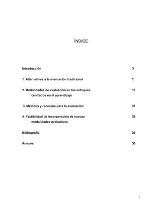 Este documento discute alternativas a la evaluación tradicional en los enfoques centrados en el aprendizaje. Describe algunas insuficiencias de la evaluación tradicional como su enfoque en la función selectiva y la medición de conocimientos en lugar del proceso de aprendizaje. Propone que la evaluación debe enfocarse en los procesos de aprendizaje individual y la construcción de conocimiento significativo. También debe ser cognitiva, estratégica y contextualizada.