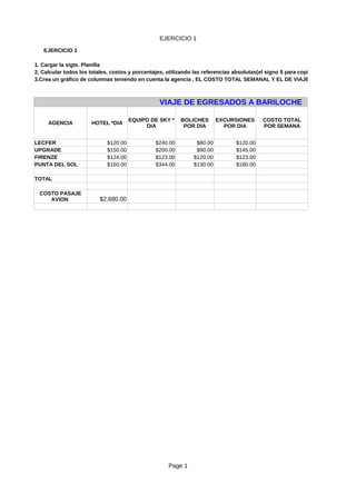 El documento presenta dos ejercicios. El primero incluye una tabla con los costos de diferentes agencias de viajes para un viaje de egresados a Bariloche. Se pide calcular los totales, costos y porcentajes usando referencias absolutas, y crear un gráfico de columnas con la agencia, el costo total semanal y el de viaje. El segundo ejercicio presenta una lista de precios y pide calcular recargos, descuentos, precios finales y porcentajes usando también referencias absolutas.