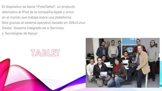 Este documento describe una tableta electrónica llamada "iFreeTablet" que funciona con el sistema operativo GNU/Linux. Explica que una tableta es un dispositivo portátil más grande que un teléfono inteligente con una pantalla táctil que se usa principalmente con los dedos. También describe las características clave de una tableta como su tamaño, procesador, sistema operativo, capacidad de almacenamiento y más. Finalmente, menciona algunos usos educativos de las tabletas en una escuela primaria en España.