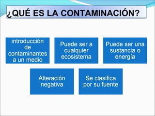 La presentación trata sobre la contaminación y describe sus principales causas y efectos. Identifica varios agentes contaminantes como plaguicidas, herbicidas, residuos urbanos y petróleo que pueden causar enfermedades, daños a los ecosistemas, afectar los fenómenos atmosféricos y debilitar la capa de ozono. Además, aborda brevemente los primeros registros de contaminación y los diferentes tipos de contaminación.