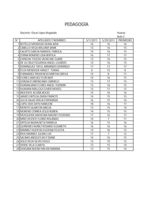 Este documento presenta los resultados de exámenes de 28 estudiantes en el curso de Pedagogía impartido por el profesor Oscar López Regalado en Huaraz. Incluye los nombres de los estudiantes, sus calificaciones en dos exámenes realizados el 5/1/2011 y 5/29/2011, y su promedio.
