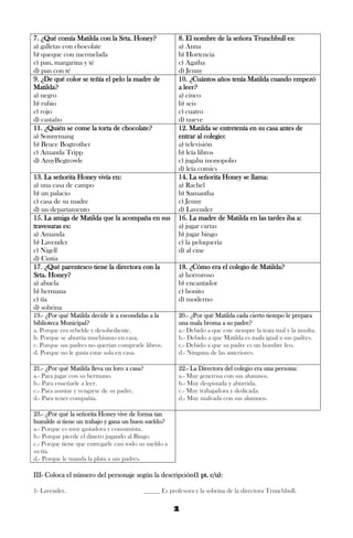 El resumen analiza un documento que contiene una evaluación de comprensión lectora sobre la novela Matilda de Roald Dahl. La evaluación consta de 6 secciones que prueban la comprensión del texto a través de preguntas de selección múltiple, emparejamiento, crucigramas y completado de oraciones. El objetivo es demostrar la capacidad de extraer información explícita e implícita de la novela.