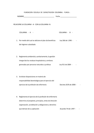 Este documento presenta una tabla con 5 entradas en la columna A relacionadas con leyes y decretos colombianos sobre salud. La columna B contiene las opciones de ley o decreto que corresponden a cada entrada en la columna A. El objetivo es relacionar correctamente cada elemento de la columna A con su respectiva ley o decreto en la columna B.