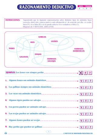 Este documento presenta una serie de tareas de pruebas de atención, concentración, razonamiento deductivo, inductivo, espacial y otras habilidades cognitivas. Se instruye al participante a marcar errores, completar series numéricas, emparejar conceptos, y resolver otros problemas en tiempos límite específicos. El documento evalúa las habilidades de un individuo para realizar múltiples tareas cognitivas bajo presión temporal.