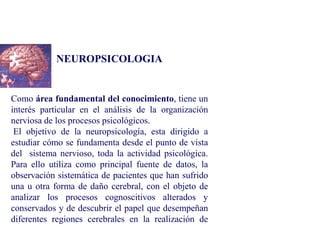 La neuropsicología estudia la organización del sistema nervioso y cómo este fundamenta la actividad psicológica. Para ello, utiliza la observación de pacientes con daño cerebral para analizar los procesos cognitivos alterados y conservados y descubrir el papel de las diferentes regiones cerebrales. La evaluación neuropsicológica consiste en explorar dominios cognitivos como la inteligencia, memoria, lenguaje, atención y funciones ejecutivas mediante pruebas específicas que permiten establecer las capacidades comprometidas y pre