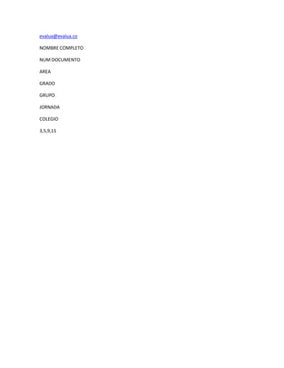 Este documento contiene información básica sobre un estudiante incluyendo su nombre completo, número de documento, área de estudio, grado, grupo, jornada y colegio al que asiste así como las notas obtenidas en las materias 3, 5, 9 y 11.