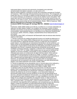 Este documento resume los antecedentes históricos y bases psicológicas de la evaluación del desempeño docente. Explica que la evaluación del desempeño ha existido desde que el hombre empleó a otros y buscó evaluar su trabajo de forma sistemática, especialmente en gobiernos y fuerzas armadas a comienzos del siglo XX. También describe la evaluación del desempeño como un proceso formal para medir la eficacia y eficiencia de docentes y equipos educativos de forma periódica, con el objetivo de proveer retroal