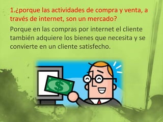 Las actividades de compra y venta a través de Internet constituyen un mercado porque los clientes adquieren los bienes que necesitan y quedan satisfechos. Es importante para las empresas estudiar a los clientes para conocer sus gustos y preferencias, y así aumentar las ventas y tener clientes satisfechos que seguirán comprando en la empresa.