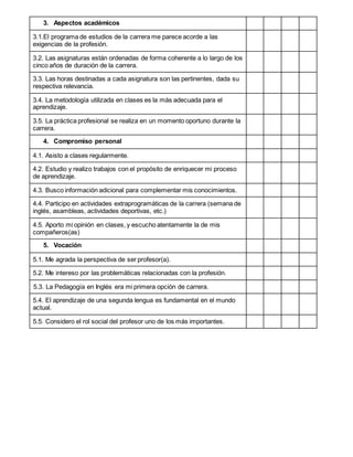 La encuesta busca medir el grado de satisfacción de los estudiantes de tercer año de Pedagogía en Inglés en la Universidad de Santiago de Chile con respecto a su carrera. La encuesta contiene afirmaciones sobre relaciones interpersonales, infraestructura y recursos, aspectos académicos, compromiso personal y vocación, y pide a los estudiantes que indiquen su grado de acuerdo con cada afirmación. Los resultados se utilizarán para la asignatura de Evaluación de los Aprendizajes.