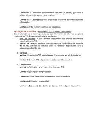 El documento describe tres estrategias para evaluar los medios TIC: 1) Autoevaluación por los productores, que permite mejorar el material de forma continua pero puede ser subjetiva, 2) Juicio de expertos, que aporta opiniones cualificadas pero depende de los expertos seleccionados, 3) Evaluación por y desde los usuarios, que es la más importante porque involucra a los destinatarios pero requiere más tiempo y recursos.