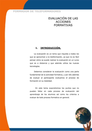 El documento describe los criterios y procedimientos para evaluar cursos online. Explica que la evaluación debe ser continua y planificada, evaluando tanto el aprendizaje de los alumnos como el proceso formativo en general. Se debe evaluar inicialmente, durante todo el curso a través de actividades, y de forma final para certificar el nivel alcanzado. El documento también lista criterios de calidad para evaluar aspectos funcionales y relacionados con el entorno telemático de los cursos online.
