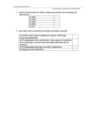 El documento presenta un cuestionario de 7 preguntas sobre atención inmediata de recién nacidos para ser respondido. Las preguntas cubren temas como los parámetros para calcular la edad gestacional, los parámetros considerados en la puntuación de Apgar, las características de un recién nacido pletórico y las acciones a tomar ante la presencia de meconio en el líquido amniótico.