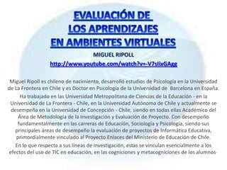 El documento presenta información sobre Miguel Ripoll, un psicólogo chileno que se ha desempeñado en varias universidades de Chile y España. Sus líneas de investigación se enfocan en los efectos del uso de las TIC en la educación y en las cogniciones y metacogniciones de los estudiantes. También resume conceptos clave sobre evaluación del aprendizaje y de programas educativos según diferentes autores y propone algunas herramientas para la evaluación en entornos virtuales.