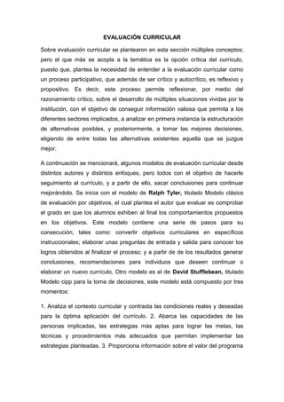 Este documento presenta un resumen de conceptos clave sobre la evaluación curricular, incluyendo la opción crítica del currículo que enfatiza un enfoque participativo y reflexivo para mejorar el currículo. Luego describe varios modelos de evaluación curricular, incluyendo el modelo clásico de Tyler basado en objetivos y el modelo CIPP de Stufflebeam para la toma de decisiones. Finalmente, destaca algunos elementos que deben considerarse en el diseño del currículo de cada establecimiento educativo de acuerdo a la ley, como los fines de la