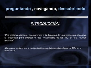 El documento propone implementar acciones para promover el uso responsable de las tecnologías de la información y la comunicación (TIC) en una institución educativa. Se busca capacitar a docentes, concientizar a estudiantes y familias sobre riesgos como el ciberacoso, y generar un debate entre los actores de la comunidad educativa sobre esta temática. Se implementarán talleres, foros de discusión y una comisión de TIC para abordar esta problemática de manera integral.