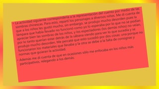 La estudiante realizó su primera práctica docente en un jardín de niños. Trabajó con un grupo de segundo grado en actividades relacionadas con el lenguaje y la comunicación. Planificó contar un cuento y representarlo con teatro de sombras chinas. Aunque su intervención fue limitada, buscó crear empatía con los niños y hacer la actividad dinámica e interesante. Más adelante, se llevó a cabo un tianguis literario donde los niños pudieron interactuar con diferentes géneros, aunque hub