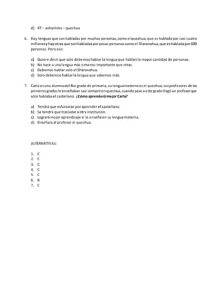 Este documento presenta 7 preguntas de evaluación sobre conocimientos lingüísticos y de comunicación para estudiantes de 3er grado. La mayoría de las preguntas tratan sobre la estructura de diferentes tipos de textos como reportajes e informes, y sobre lenguas indígenas del Perú como el quechua y aimara. Una pregunta también reconoce que todas las lenguas, incluso las habladas por pocas personas, son igualmente importantes.