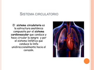El documento describe el sistema circulatorio humano, el cual está compuesto por el sistema cardiovascular formado por el corazón, los vasos sanguíneos y la sangre, y el sistema linfático. El sistema circulatorio transporta alimentos, oxígeno y desechos a través del cuerpo y está involucrado en los procesos de respiración e intercambio de gases.