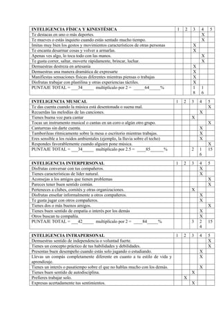 Este documento presenta los resultados de una evaluación de inteligencias múltiples realizada a una persona. La evaluación consistió en un test de 80 preguntas que midieron 8 tipos de inteligencia. Los resultados mostraron que las inteligencias mejor desarrolladas fueron lógico-matemática, musical e interpersonal, mientras que la espacial obtuvo el puntaje más bajo. El documento también explica brevemente cada tipo de inteligencia y cómo aprende mejor cada una.