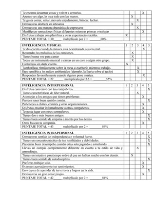 Este documento presenta un test de inteligencias múltiples para evaluar las diferentes habilidades de una persona. El test contiene preguntas sobre inteligencia lingüística, lógica-matemática, espacial, física-kinestésica, musical, interpersonal e intrapersonal. Al final, muestra los resultados porcentuales de cada área e identifica el orden de prioridad de las inteligencias evaluadas.