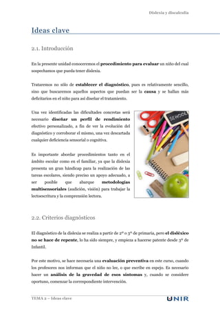 Este documento describe el procedimiento para evaluar a un niño con posible dislexia. Incluye entrevistar al tutor, evaluar el nivel de lectura y escritura adquirido, realizar una evaluación neuropsicológica, evaluar el cociente intelectual, evaluar la percepción y evaluar la conciencia fonológica del niño. El objetivo es identificar las dificultades específicas del niño para diseñar un tratamiento personalizado.