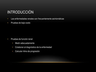 Este documento describe los métodos para evaluar la función renal, incluyendo pruebas para medir la filtración glomerular, como el aclaramiento de creatinina y la concentración de creatinina en suero. También cubre cómo evaluar la función tubular midiendo la excreción de electrolitos como el sodio, y la capacidad de concentración y dilución mediante el análisis de la osmolaridad plasmática y urinaria. El objetivo es diagnosticar enfermedades renales mediante el cálculo preciso de la tasa de filtración glomerular